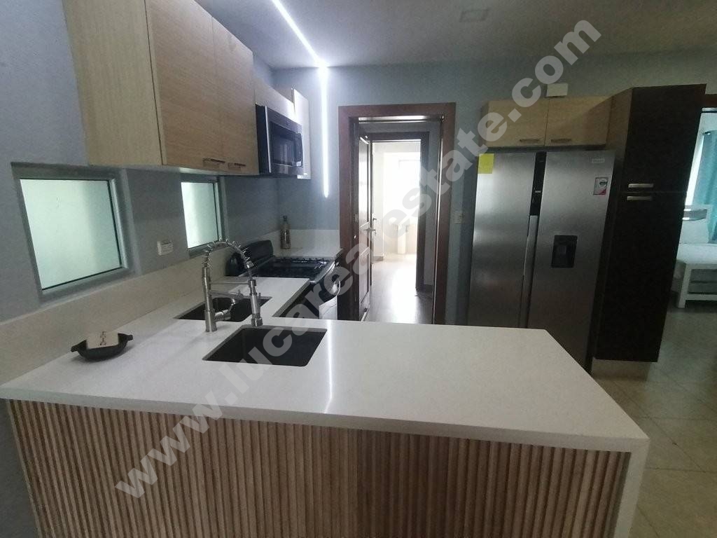 It consists of two bedrooms with wall closet and bathroom, large living room with dining room, fully equipped kitchen with granite countertop and breakfast area, guest bathroom, laundry area, service room with bathroom, large furnished balcony and two reserved parking spaces.