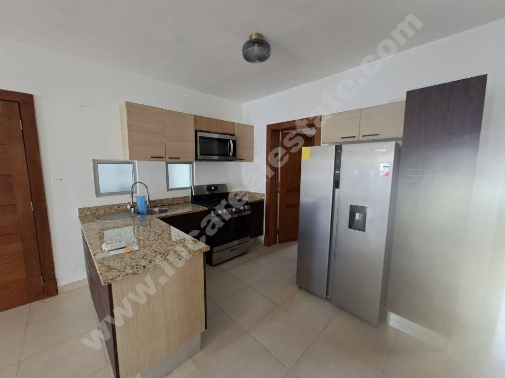 Se compone de dos habitaciones con closet a pared y baño, amplia sala con área comedor, cocina enteramente equipada con encimera y desayunador en granito y linea blanca, baño para huésped, área de lavado, cuarto de servicio con baño, grande balcón y dos parqueos reservados.