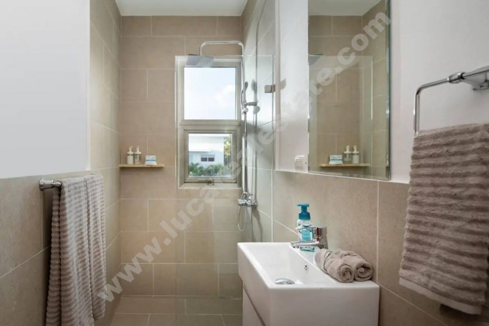 On the first level are the master bedroom which has a king size bed, air conditioning, wardrobe and ensuite bathroom with elegant shower, a spacious living room with an open layout with glass doors, a dining table with 8 seats, a nice sofa seating area, a TV and a ceiling fan, the modern kitchen with island is fully equipped with everything you need to cook wonderful and delicious meals, plus laundry area and utility room with bathroom.