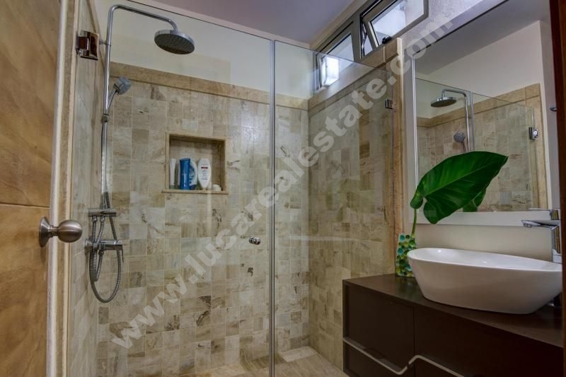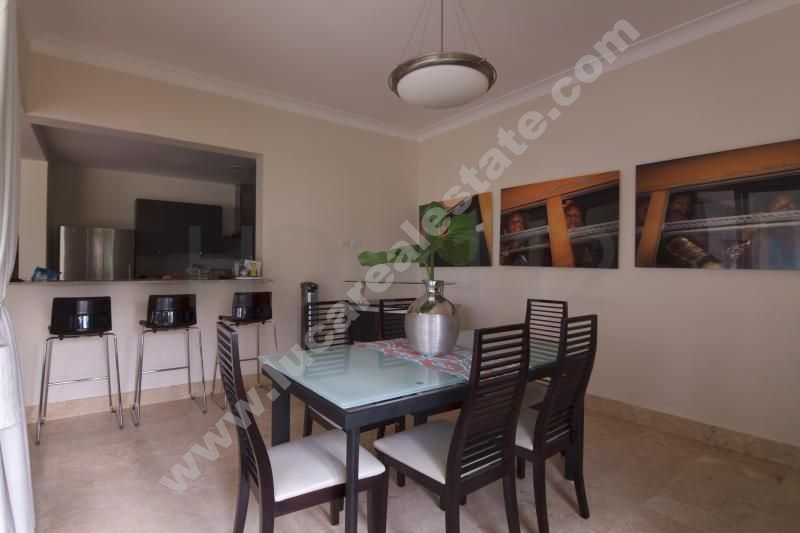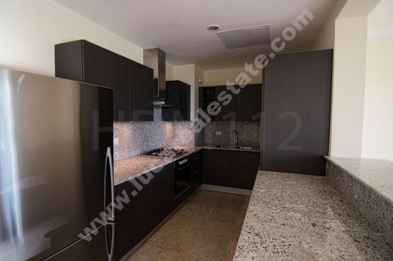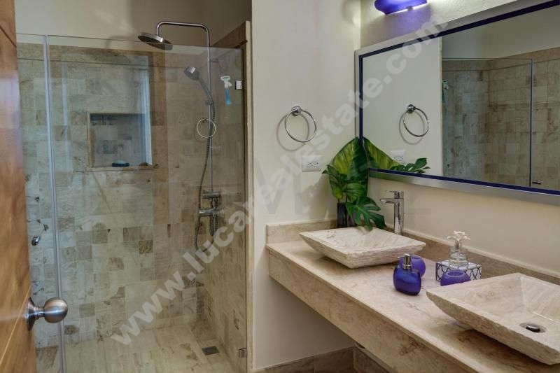 El apartamento está totalmente amueblado y las terminaciones son de primera calidad: pisos de piedra coralina, cocinas modulares con encimeras de granito, estufa y horno empotrados y nevera, baños acabados en piedra coralina, puertas macizas construidas de madera de roble, aluminio europeo en ventanas.