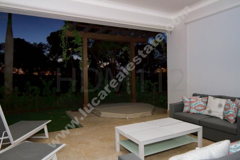 Ubicado en el primer nivel del complejo Hacienda del mar con jacuzi privada y tiene su propia área de ocio y piscina, al apartamento tiene un amplio patio para vivir con piso en piedra coralina y un jacuzzi privado con vista al jardín del complejo.